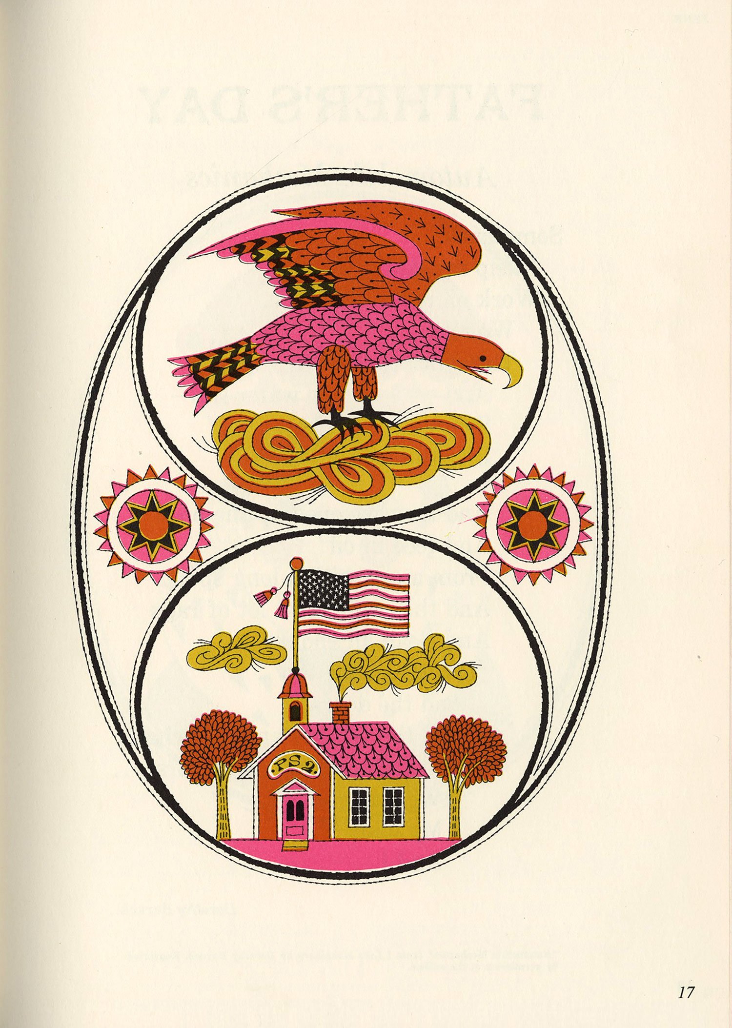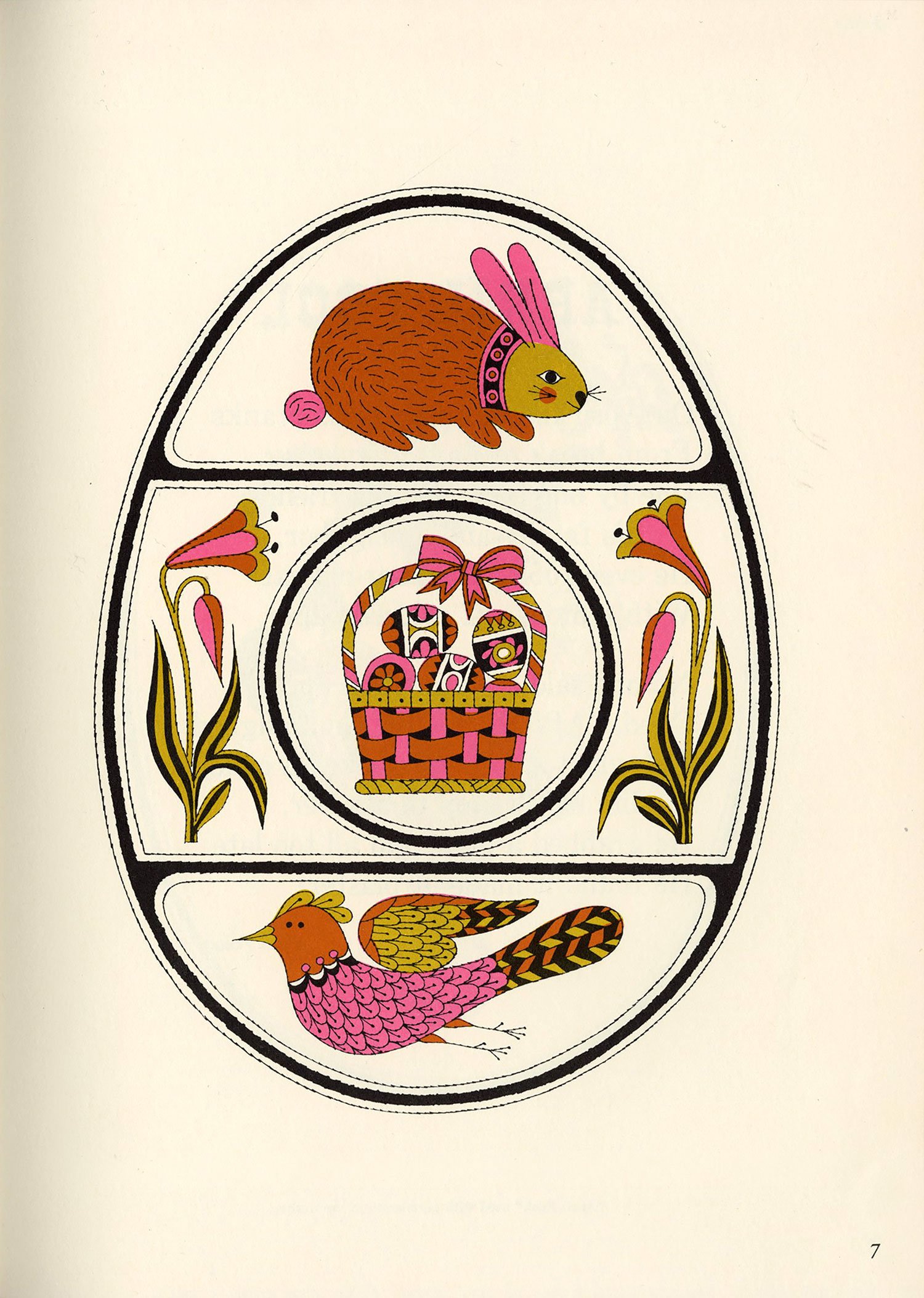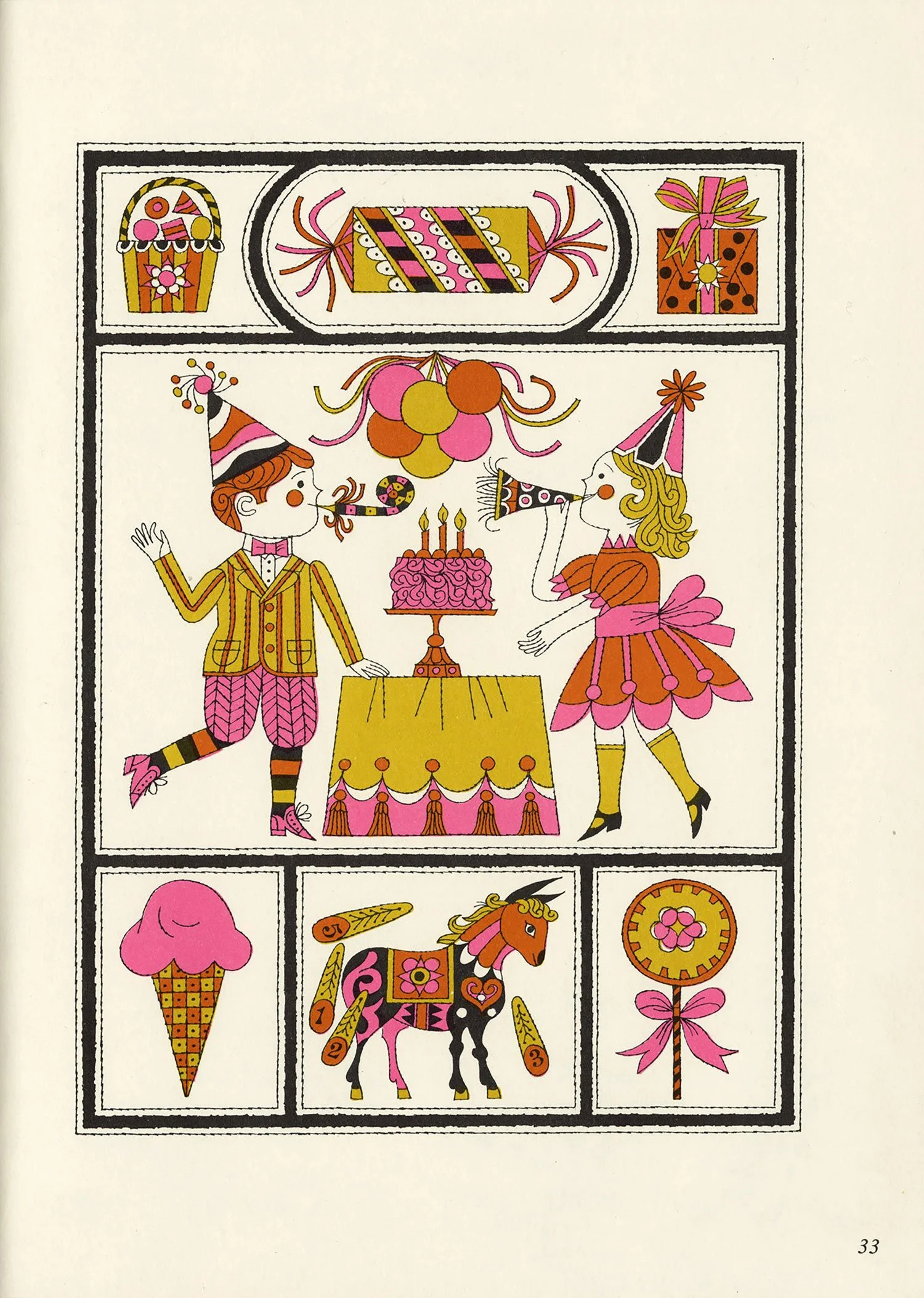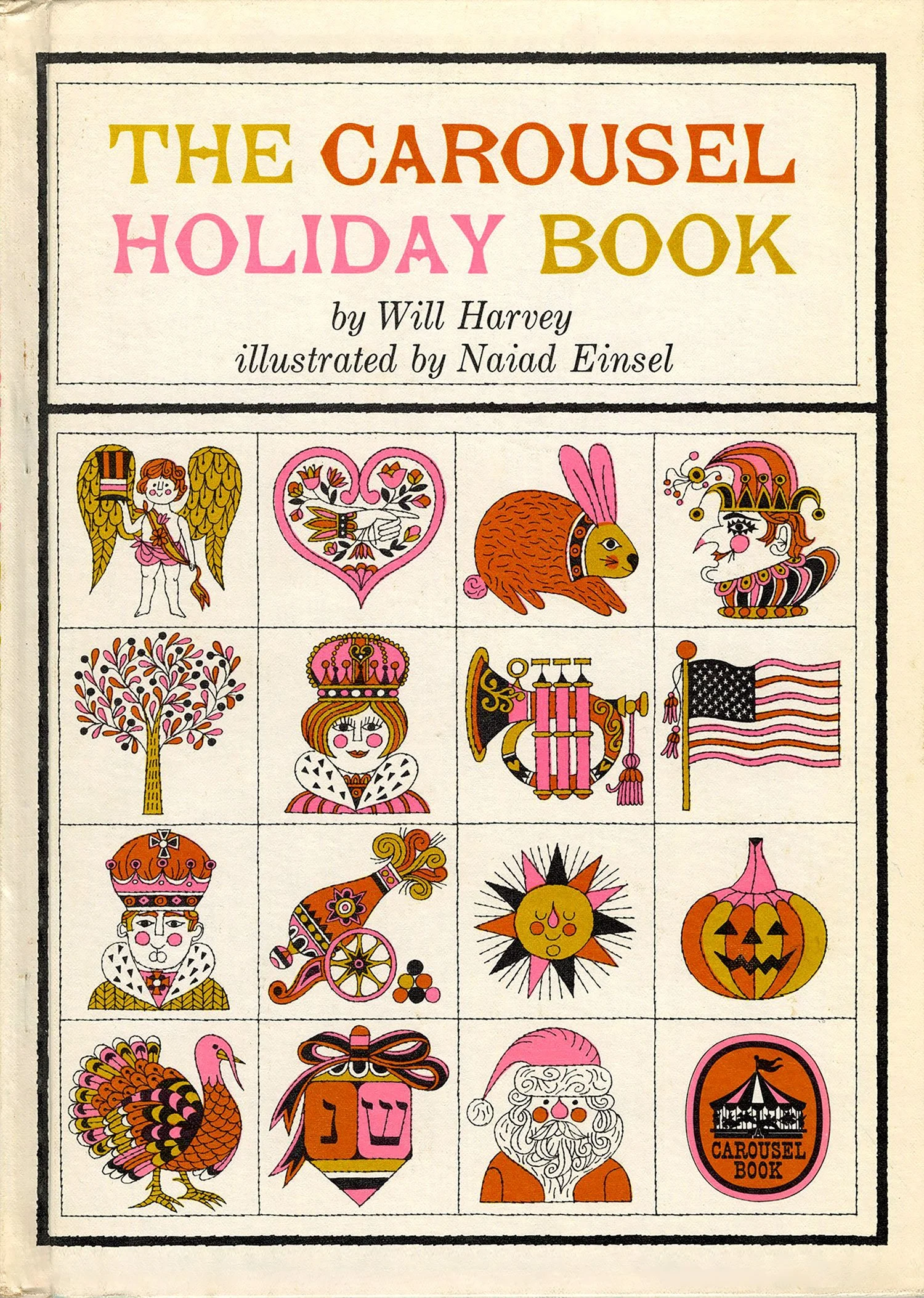 After a bit of a hiatus, I finally dusted off the scanner this afternoon. This book surfaced at the top of my pile randomly but fortuitously, as it’s been a while since I’ve posted anything by Naiad Einsel, one of my favorite illustrators. Alongside her delightful artwork, I love the simple but effective use of a different display typeface on each page, the oh-so-mid-century pink-and-gold color palette, and the various borders framing each illustration.
