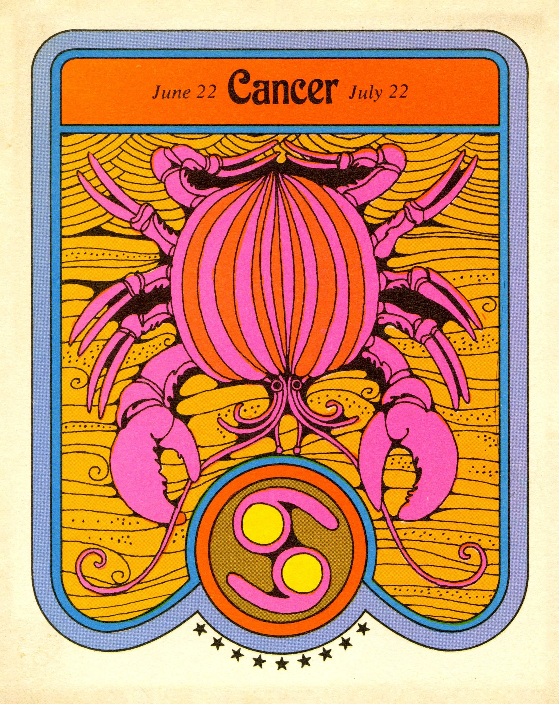 Here are nine of the twelve zodiac signs illustrated by David Johnson for the Cube Card Company in 1969.