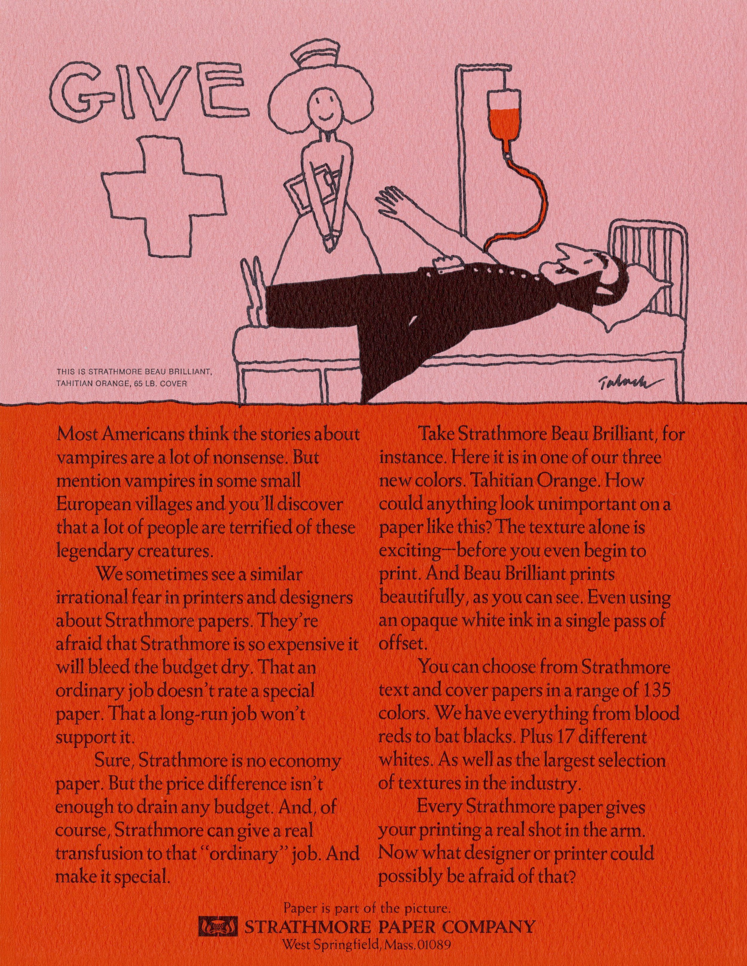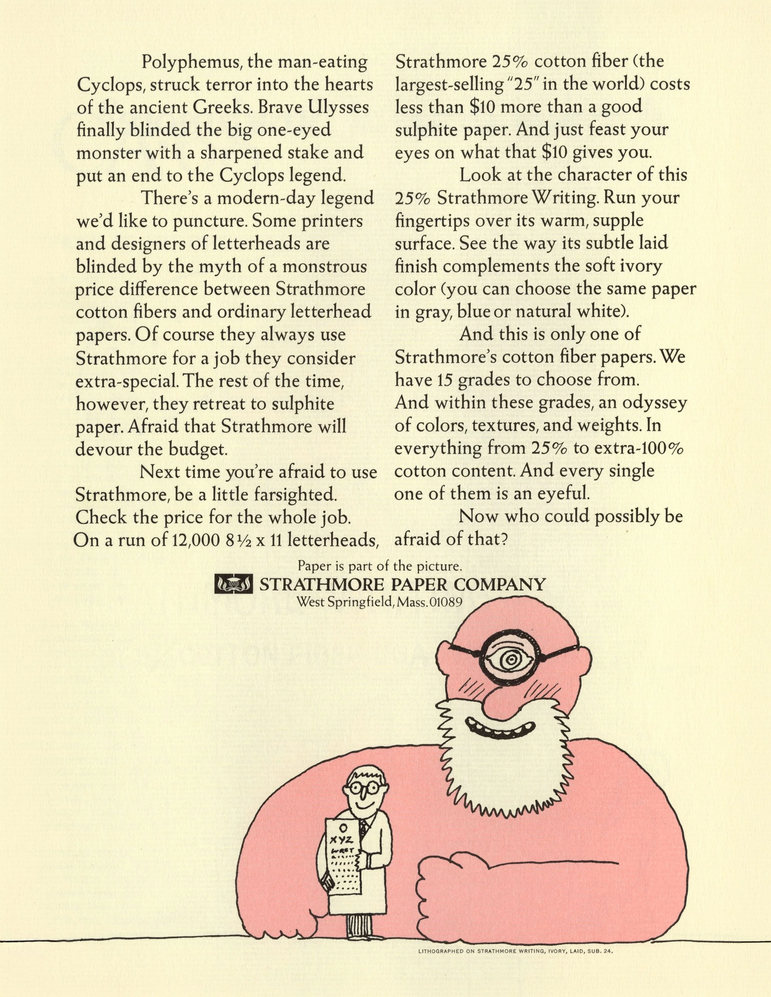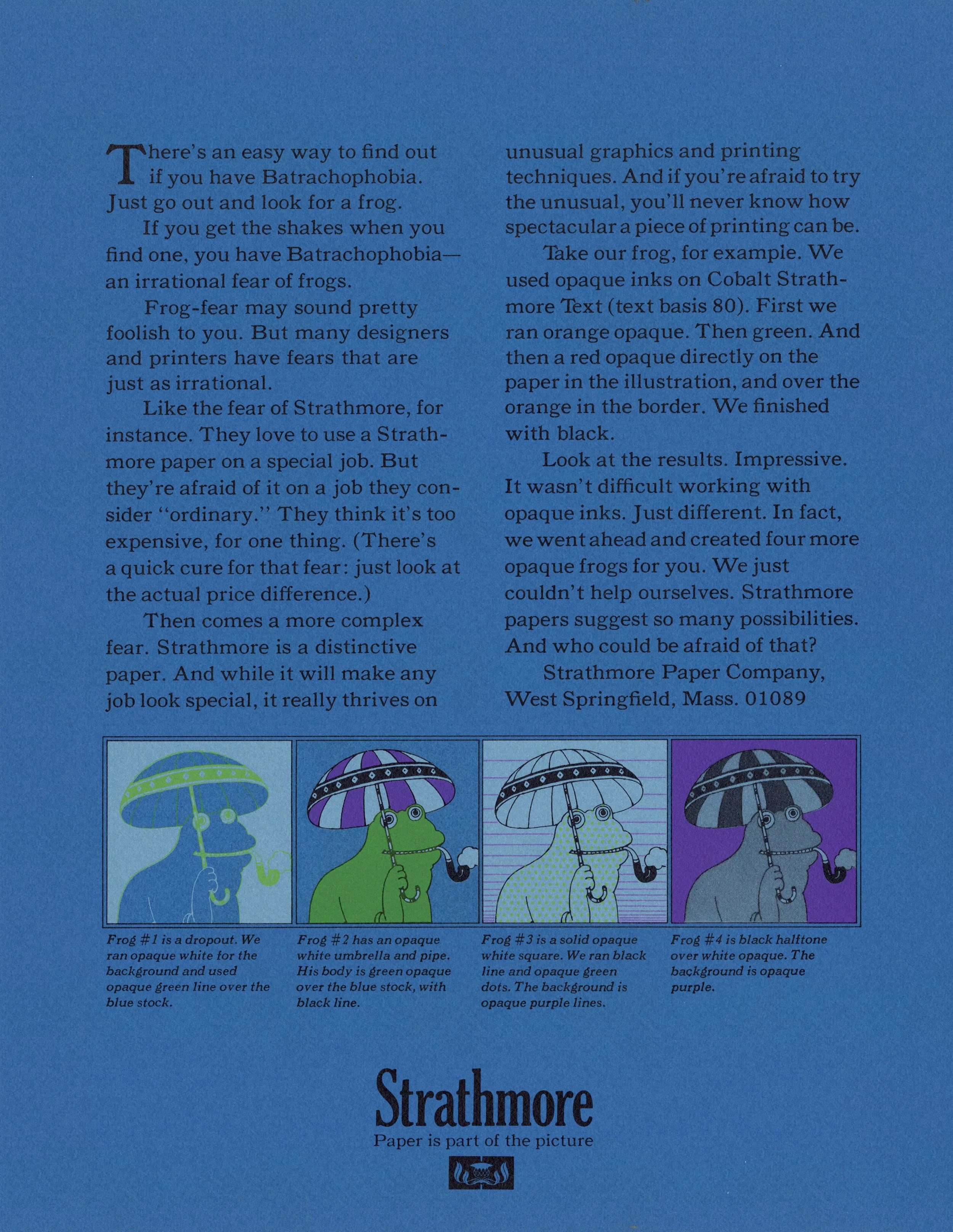 Here are four examples from two ad campaigns by Strathmore Paper Co. The first series, Who’s Afraid of Strathmore, ran loosely from 1968 to 1969 and was illustrated by Simms Taback. The second series, Irrational Fears, began around 1970 and was illustrated by Seymour Chwast. Both were two-sided ads printed on various Strathmore paper stocks and inserted into popular design magazines of the time, such as Graphis, Print, CA (Communication Arts), and AD (Art Directors).