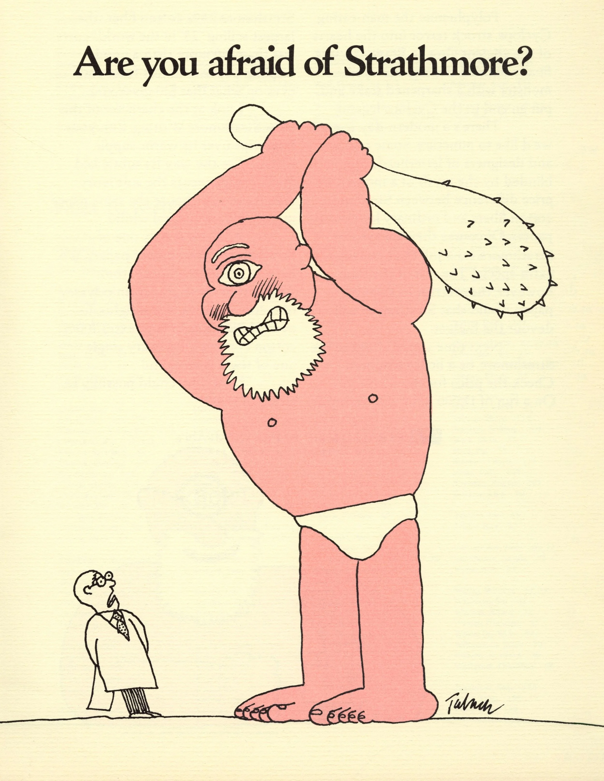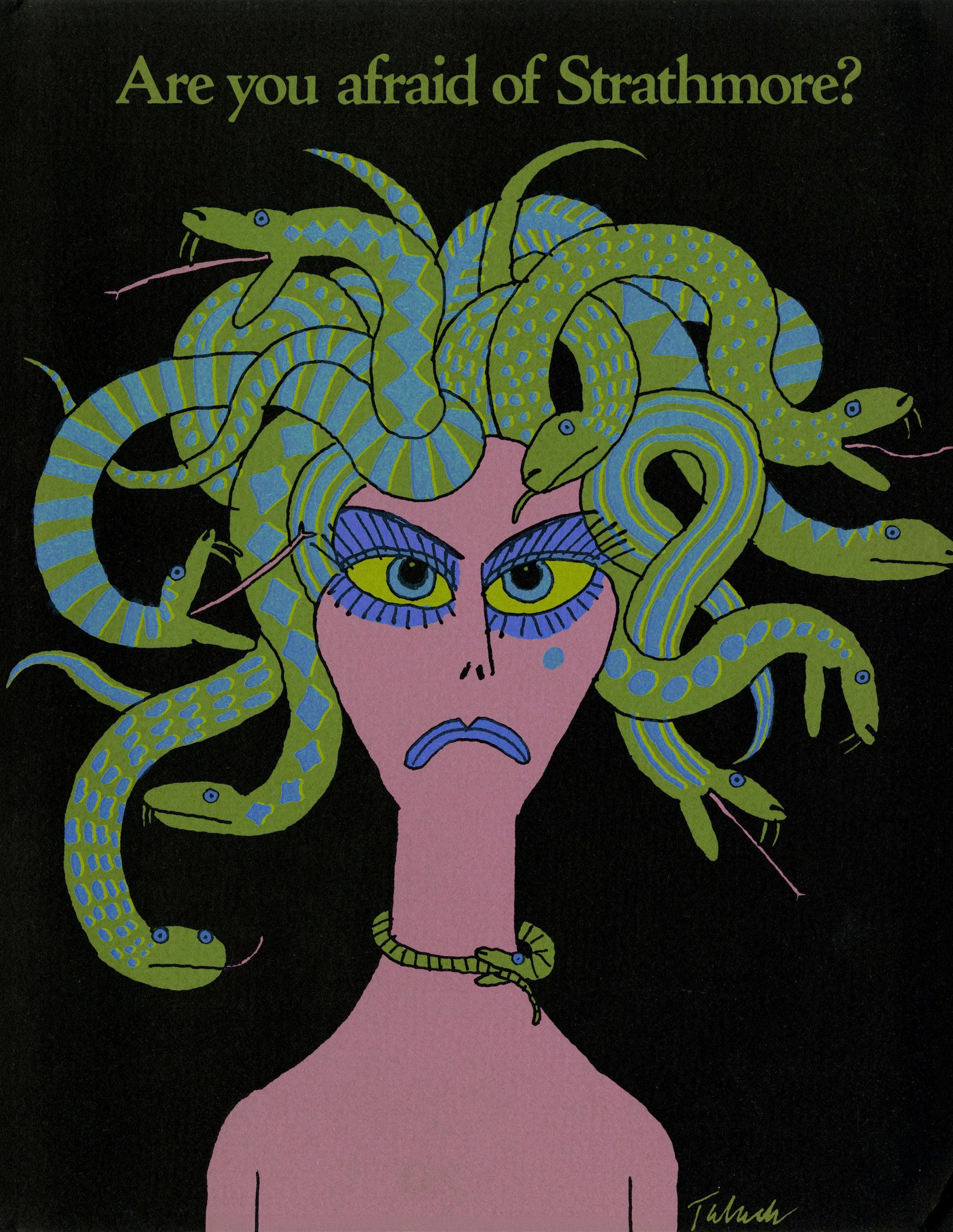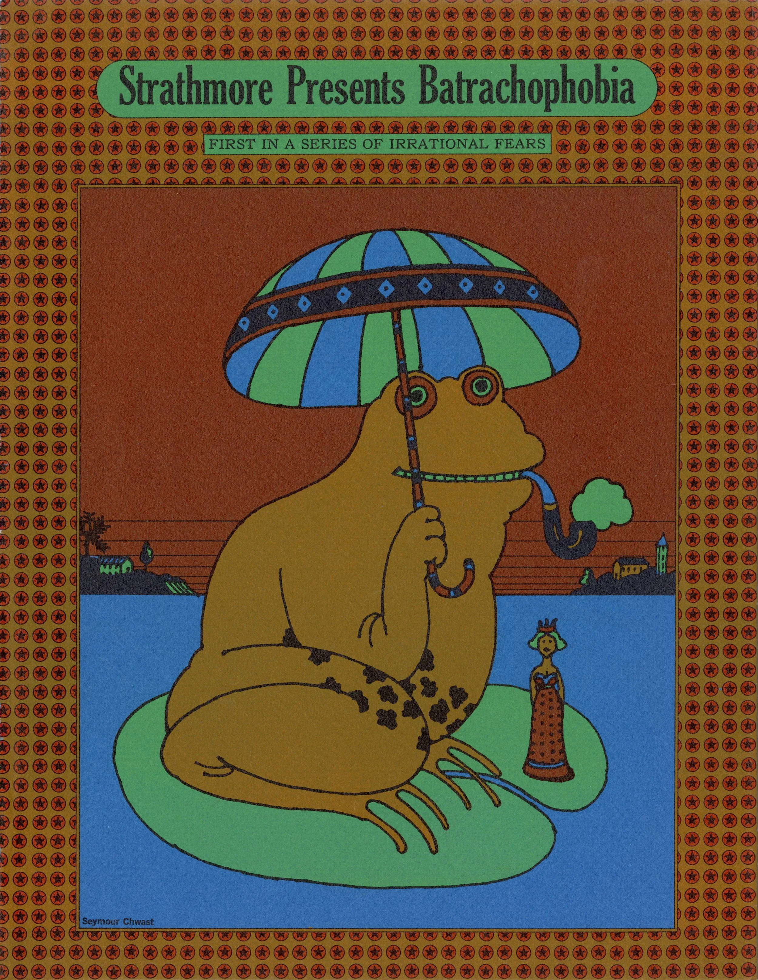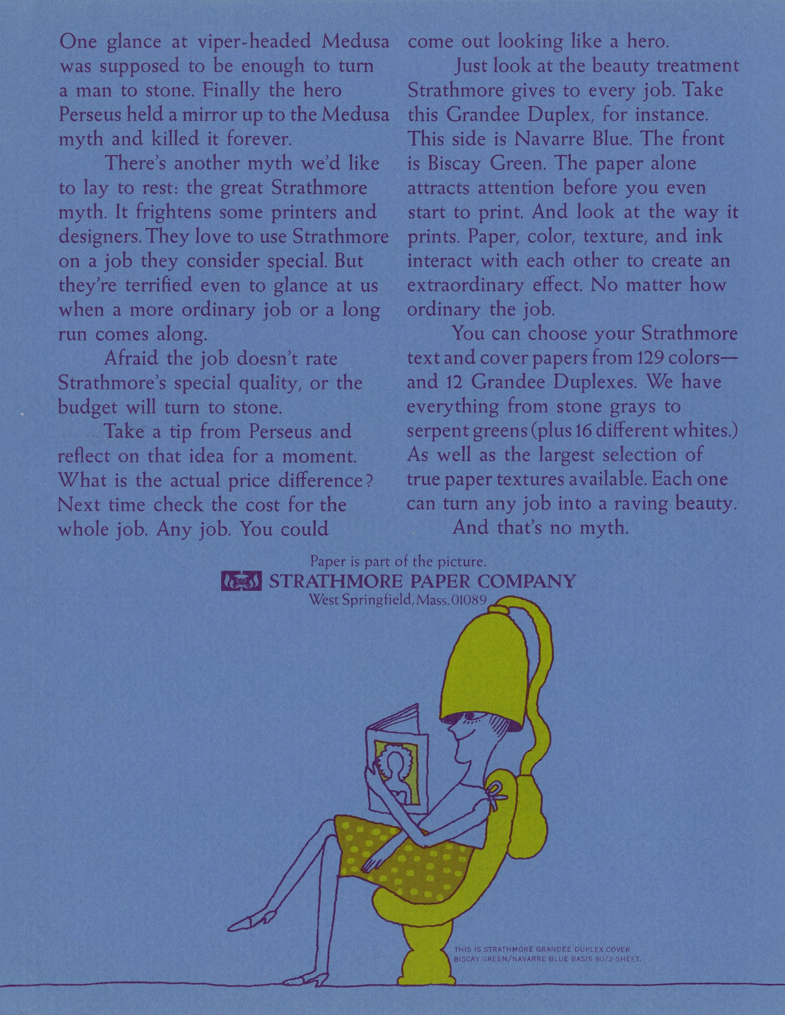 Here are four examples from two ad campaigns by Strathmore Paper Co. The first series, Who’s Afraid of Strathmore, ran loosely from 1968 to 1969 and was illustrated by Simms Taback. The second series, Irrational Fears, began around 1970 and was illustrated by Seymour Chwast. Both were two-sided ads printed on various Strathmore paper stocks and inserted into popular design magazines of the time, such as Graphis, Print, CA (Communication Arts), and AD (Art Directors).